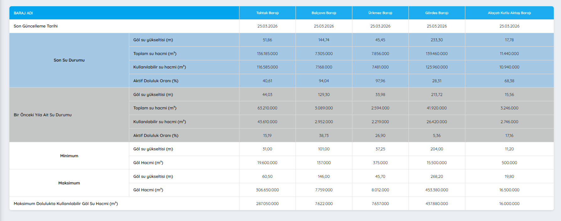 İzmir Su ve Kanalizasyon İdaresi (İZSU) tarafından yapılan 25 Mart 2026 tarihli açıklamayla İzmir'deki barajların güncel doluluk oranları aktarıldı. Meteoroloji verilerine göre 2026’nın ilk aylarında etkili olan yağışlar İzmir genelinde su kaynaklarına doğrudan etki etti. Geçtiğimiz yıl uzun yıllar ortalaması olan 712 kilogramın oldukça altında kalan yağış miktarı 2025’te 430 kilogram seviyesinde kalmış ve kentte ciddi su baskısı oluşturmuştu. Bu yıl ise yağışların artmasıyla birlikte hem barajlarda hem de yer altı su kaynaklarında toparlanma başladı. İşte detaylar..
