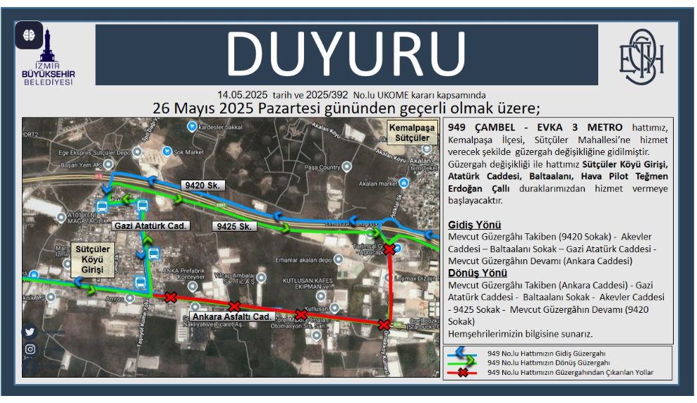 İzmir Büyükşehir Belediyesi’ne bağlı ESHOT Genel Müdürlüğü, Kemalpaşa ilçesindeki toplu ulaşımda önemli bir güzergah değişikliğine gitti. 949 numaralı Çambel – Evka 3 Metro hattında yapılan düzenlemelerle birlikte hat, Sütçüler Mahallesi’ne de ulaşım hizmeti sunmaya başlayacak.
