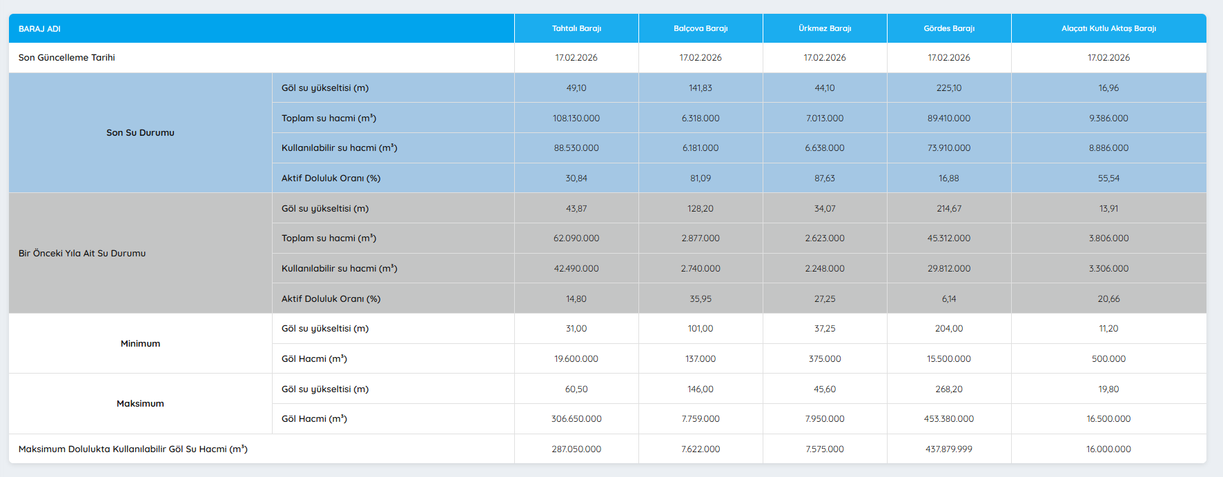 İzmir son günlerde etkisini gösteren sağanak yağışların ardından barajlardaki doluluk oranlarında belirgin bir artış yaşandı. 17 Şubat 2026 tarihli veriler ışığında, birçok barajda toplam su hacmi ve aktif doluluk oranı geçen yıla kıyasla yükseliş gösterdi.