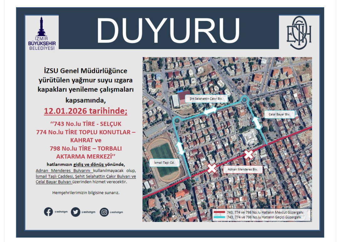 İzmir Büyükşehir Belediyesi ESHOT Genel Müdürlüğü tarafından yapılan açıklamada, şu ifadelere yer verildi: “İZSU Genel Müdürlüğü tarafından yürütülen yağmur suyu ızgara kapakları yenileme çalışmaları kapsamında 12.01.2026 tarihinde; 743 No.lu TİRE – SELÇUK, 774 No.lu TİRE TOPLU KONUTLAR – KAHRAT ve 798 No.lu TİRE – TORBALI AKTARMA MERKEZİ hatlarımızın gidiş ve dönüş yönünde, Adnan Menderes Bulvarı kullanılmayacak olup, İsmail Taşlı Caddesi, Şehit Selahattin Çakır Bulvarı ve Celal Bayar Bulvarı üzerinden hizmet verecektir. Hemşehrilerimizin bilgisine sunarız.”