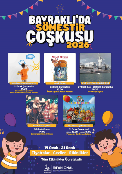Bayraklı Belediyesi Kültür, Sanat ve Sosyal İşler Müdürlüğü koordinesinde düzenlenen Bayraklı’da Sömestr Coşkusu 2026 kapsamında tiyatro gösterimleri, sanatsal atölyeler, sahne etkinlikleri ve geziler yer alıyor. Program, çocukların yarıyıl tatilini hem dinlenerek hem de nitelikli etkinliklerle geçirmesine olanak sağlıyor.