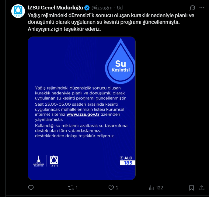 İzmir Su ve Kanalizasyon İdaresi (İZSU), kuraklık nedeniyle güncellenmiş planlı su kesintisi takvimini duyurdu. İzmir'in birçok ilçesinde 23.00-05.00 saatleri arasında su hizmeti verilemeyecek.