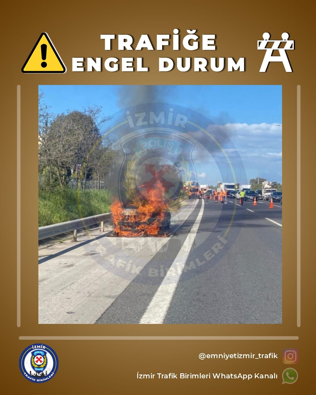 Otoyol üzerinde Narlıdere’den Balçova istikametine emniyet şeridinde araç yangını mevcuttur. Tedbir olarak sol ve orta şerit trafiğe kapatılmıştır. Geriye doğru yaklaşık 1 km. yoğunluk mevcuttur. Güzergâhı kullanacak sayın yol kullanıcılarının bilgisine sunulur.