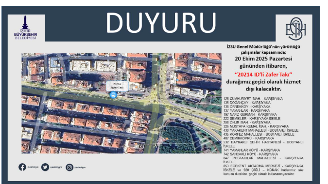 ESHOT Genel Müdürlüğü'nden yapılan açıklamada şu ifadelere yer verildi: “İZSU Genel Müdürlüğü'nün yürüttüğü çalışmalar gereğince, 20 Ekim 2025 Pazartesi gününden itibaren “20214 ID'li Zafer Takı” durağımız geçici olarak hizmet dışı kalacaktır.