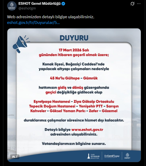 “17 Mart 2026 Salı gününden itibaren geçerli olmak üzere; Konak ilçesi, Boğaziçi Caddesi'nde yapılacak altyapı çalışmaları nedeniyle 45 No'lu Gültepe – Gümrük hattımızın gidiş ve dönüş güzergahında geçici değişikliğe gidilecek olup Eşrefpaşa Hastanesi – Ziya Gökalp Ortaokulu – Tepecik Doğum Hastanesi – Yenişehir PTT – Sarışın – Kahveler – Göksel Yaman Parkı – Zafer – Gözemel duraklarımız çalışmalar süresince hizmet dışı kalacaktır. Detaylı bilgiye www.eshot.gov.tr adresinden ulaşabilirsiniz.”