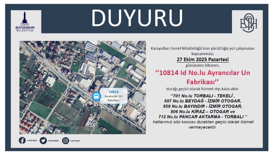 ESHOT Genel Müdürlüğü tarafından yapılan açıklamada, şu ifadelere yer verildi: “Karayolları Genel Müdürlüğü'nün yürüttüğü yol çalışmaları kapsamında; 27 Ekim 2025 Pazartesi gününden itibaren “10814 Id No.lu Ayrancılar Un Fabrikası” durağı geçici olarak hizmet dışı kalacaktır. 701 No.lu TORBALI – TEKELİ, 697 No.lu BEYDAĞ – İZMİR OTOGAR, 858 No.lu BAYINDIR – İZMİR OTOGAR, 806 No.lu KİRAZ – OTOGAR ve 712 No.lu PANCAR AKTARMA – TORBALI hatlarımız bu duraktan geçici olarak hizmet vermeyecektir.”