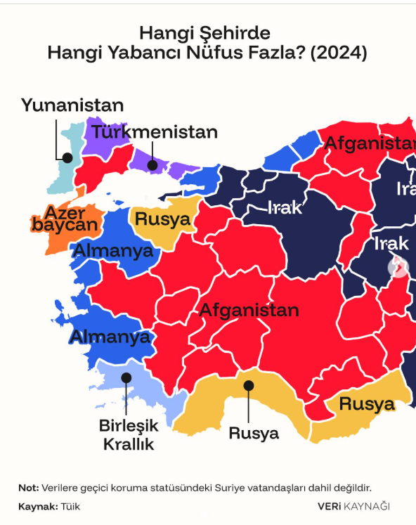 TÜİK verilerine göre, 28 ilde yabancı nüfusun en kalabalık grubu Afganistan vatandaşları olurken, İzmir'de bu durum farklılık göstermektedir. İzmir'deki en fazla yabancı nüfus, Alman vatandaşlarından oluşmaktadır.
