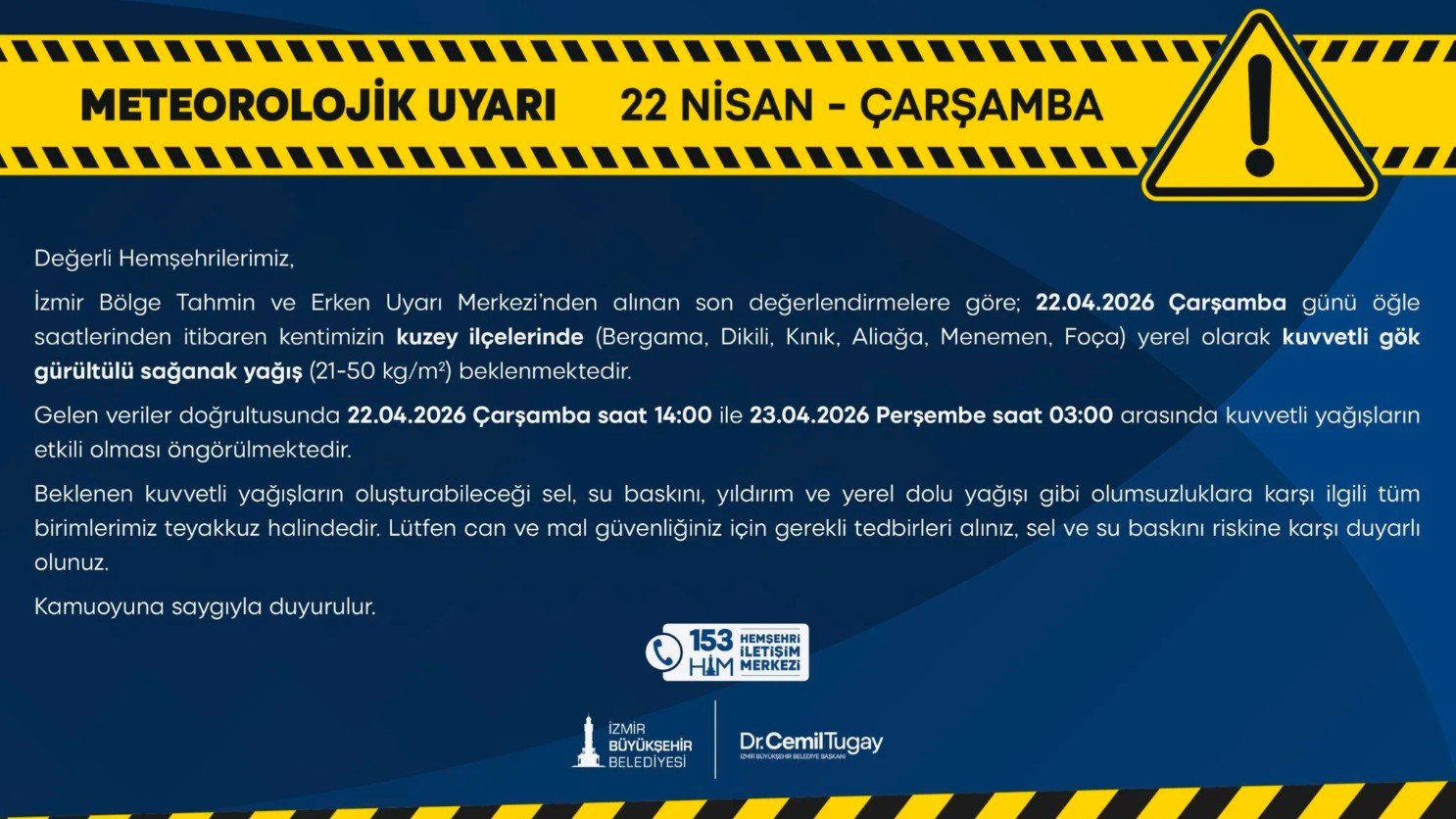Meteoroloji Genel Müdürlüğü’nden alınan son bilgilere göre İçişleri Bakanlığı İzmir için yarın (22 Nisan 2026 Çarşamba günü) yerel kuvvetli sağanak ve gök gürültülü sağanak yağış beklendiğini belirterek sarı kodla uyarıda bulundu.