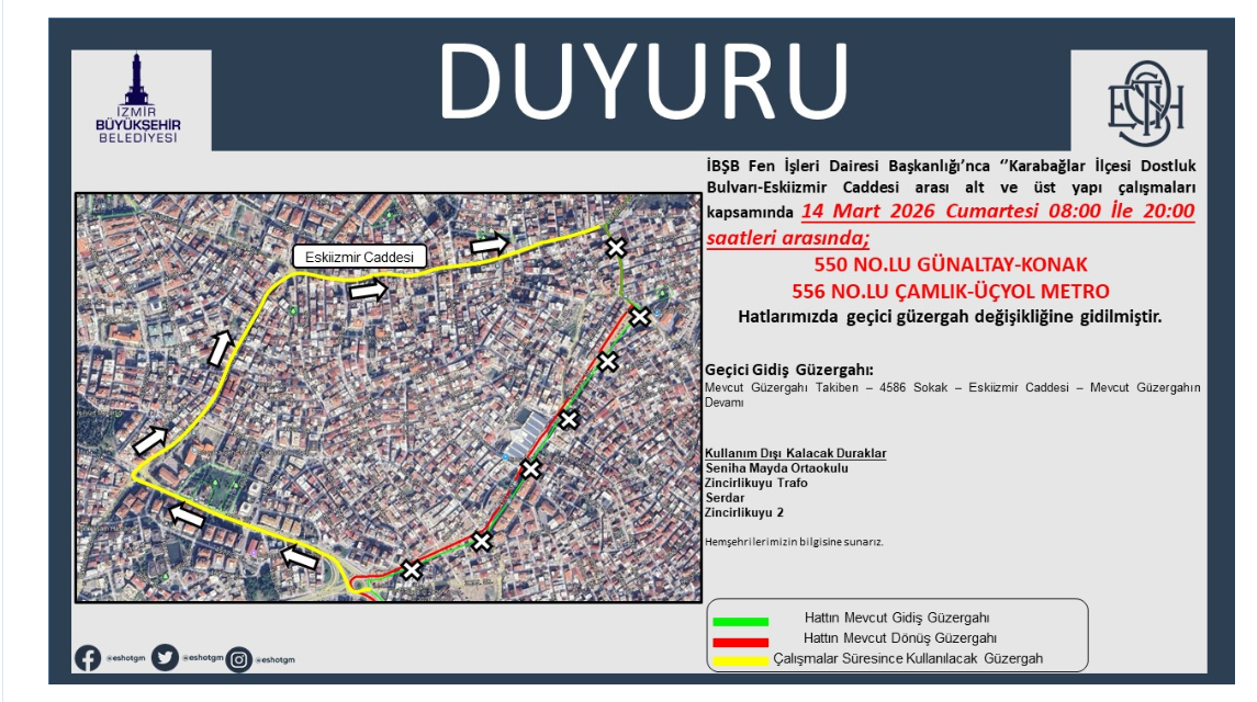 “14 Mart 2026 Cumartesi günü 08.00 – 20.00 saatleri arasında geçerli olmak üzere; İzmir Büyükşehir Belediyesi, Fen İşleri Dairesi Başkanlığı tarafından Karabağlar ilçesi, Dostluk Bulvarı ve Eski İzmir Caddesi arasında yapılan altyapı ve üstyapı çalışmaları nedeniyle 550 No'lu Günaltay – Konak, 556 No'lu Çamlık – Üçyol Metro hatlarımızda geçici güzergah değişikliğine gidilecek olup Seniha Mayda Ortaokulu – Zincirlikuyu Trafo – Serdar – Zincirlikuyu 2 duraklarımız çalışmalar süresince hizmet dışı kalacaktır.”