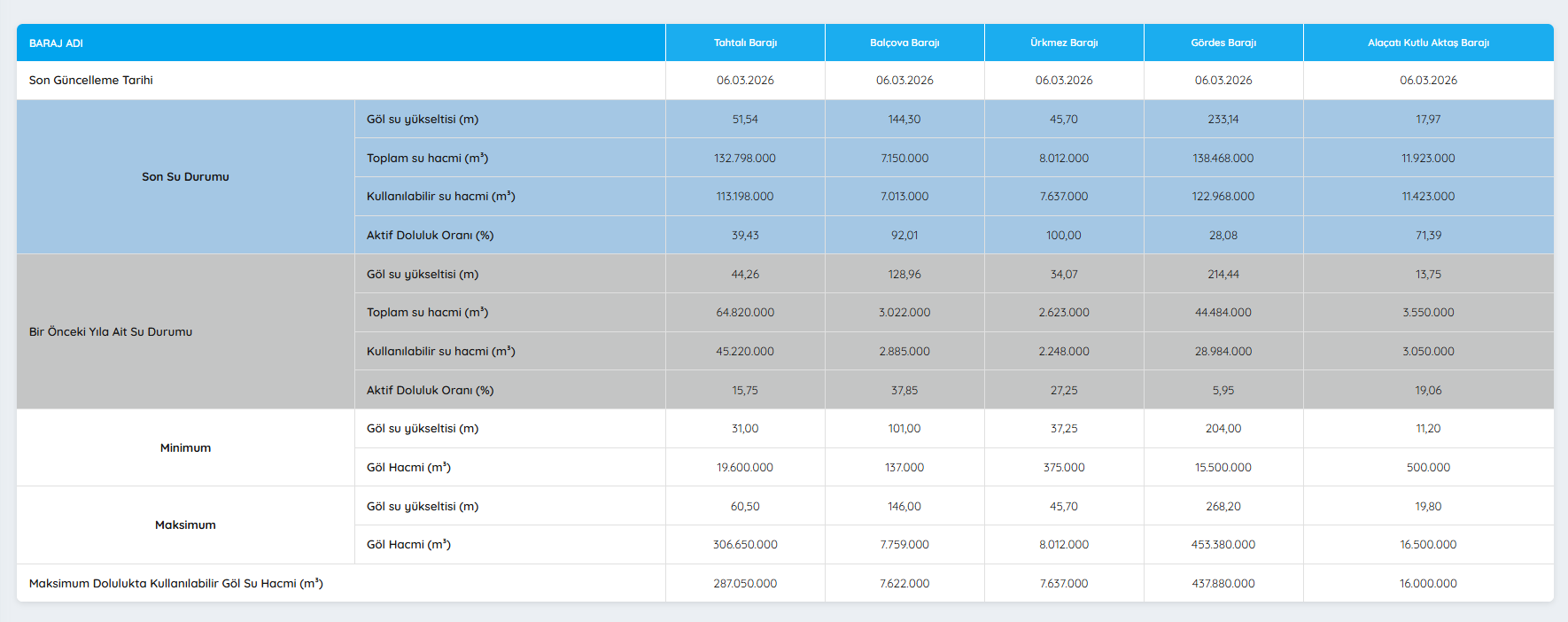İzmir Su ve Kanalizasyon İdaresi (İZSU), 6 Mart 2026 tarihli baraj doluluk oranlarını açıkladı. Kış aylarında etkili olan yağışlar bazı barajlarda toparlanma sağladı. Ancak İzmir'in ana içme suyu kaynağı Tahtalı Barajı ile takviye sistemi olan Gördes Barajı’nda seviyelerin kritik eşiklerin altında olduğu görüldü.