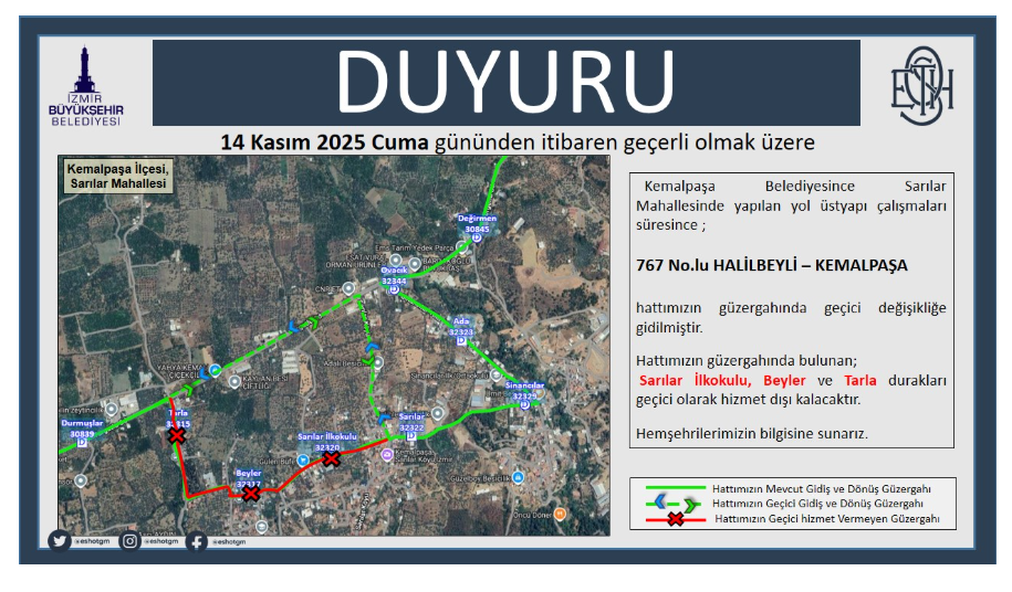 ESHOT, konuya ilişkin yaptığı açıklamada şu ifadelere yer verdi: “Kemalpaşa Belediyesince Mahallesinde gerçekleştirilen yol üstyapı çalışmaları süresince; 767 No.lu HALİLBEYLİ – KEMALPAŞA hattımızın güzergahında geçici değişikliğe gidilmiştir. Hattımızın güzergahında bulunan; Sarılar İlkokulu, Beyler ve Tarla durakları geçici olarak hizmet dışı kalacaktır.”