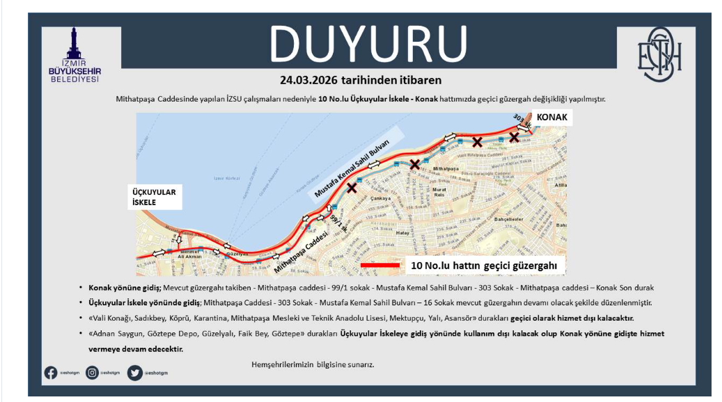 “24.03.2026 tarihinden itibaren Mithatpaşa Caddesinde yapılan İZSU çalışmaları nedeniyle 10 No.lu Üçkuyular İskele – Konak hattımızda geçici güzergah değişikliği yapılmıştır.