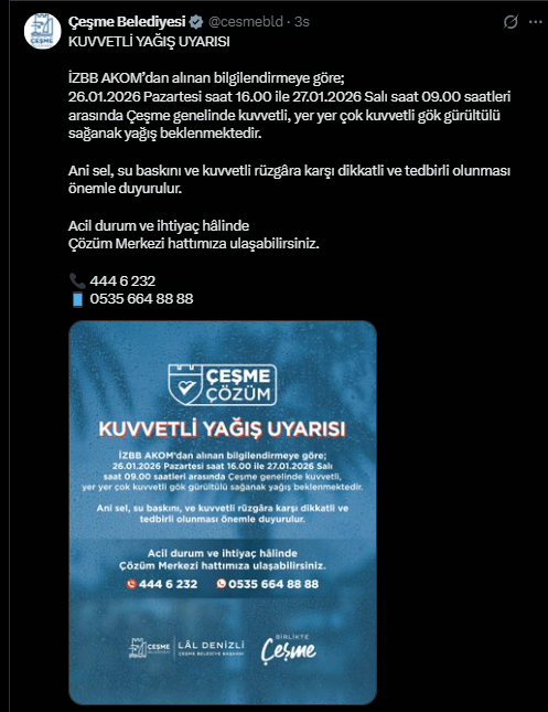 Çeşme Belediyesi’nin yaptığı açıklamada şu ifadeler yer aldı: “KUVVETLİ YAĞIŞ UYARISI İzBB AKOM'dan alınan bilgiye göre; 26.01.2026 Pazartesi saat 16.00 ile 27.01.2026 Salı saat 09.00 arasında Çeşme genelinde güçlü ve yer yer çok güçlü gök gürültülü sağanak yağış beklenmektedir.