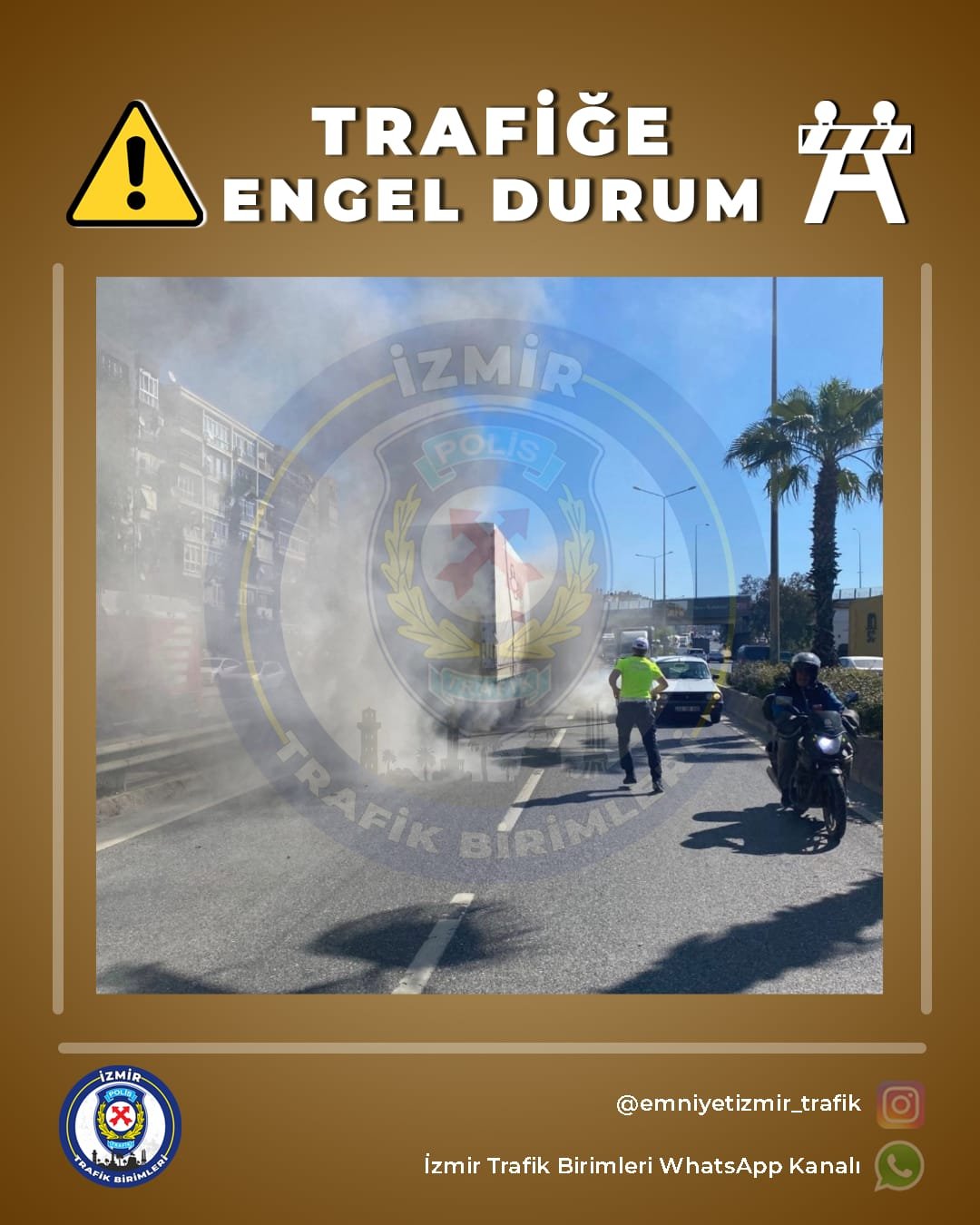 “Ankara Caddesi Hastane Viyadüğü inişi merkez istikametinde tır yangını mevcuttur. Bölgede geriye doğru trafik yoğunluğu bulunmaktadır. Güzergâhı kullanacak sayın yol kullanıcılarının bilgisine sunulur.”
