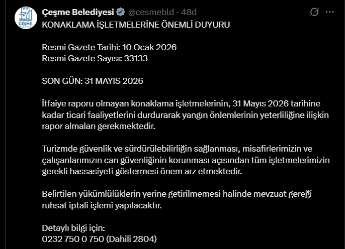 “KONAKLAMA İŞLETMELERİNE ÖNEMLİ DUYURU Resmi Gazete Tarihi: 10 Ocak 2026 Resmi Gazete Sayısı: 33133 SON GÜN: 31 MAYIS 2026 İtfaiye raporu olmayan konaklama işletmelerinin, 31 Mayıs 2026 tarihine kadar ticari faaliyetlerini durdurarak yangın önlemlerinin yeterliliğine ilişkin rapor almaları gerekmektedir. Turizmde güvenlik ve sürdürülebilirliğin sağlanması, misafirlerimizin ve çalışanlarımızın can güvenliğinin korunması açısından tüm işletmelerimizin gerekli hassasiyeti göstermesi önem arz etmektedir. Belirtilen yükümlülüklerin yerine getirilmemesi halinde mevzuat gereği ruhsat iptali işlemi yapılacaktır. Detaylı bilgi için: 0232 750 0 750 (Dahili 2804)”