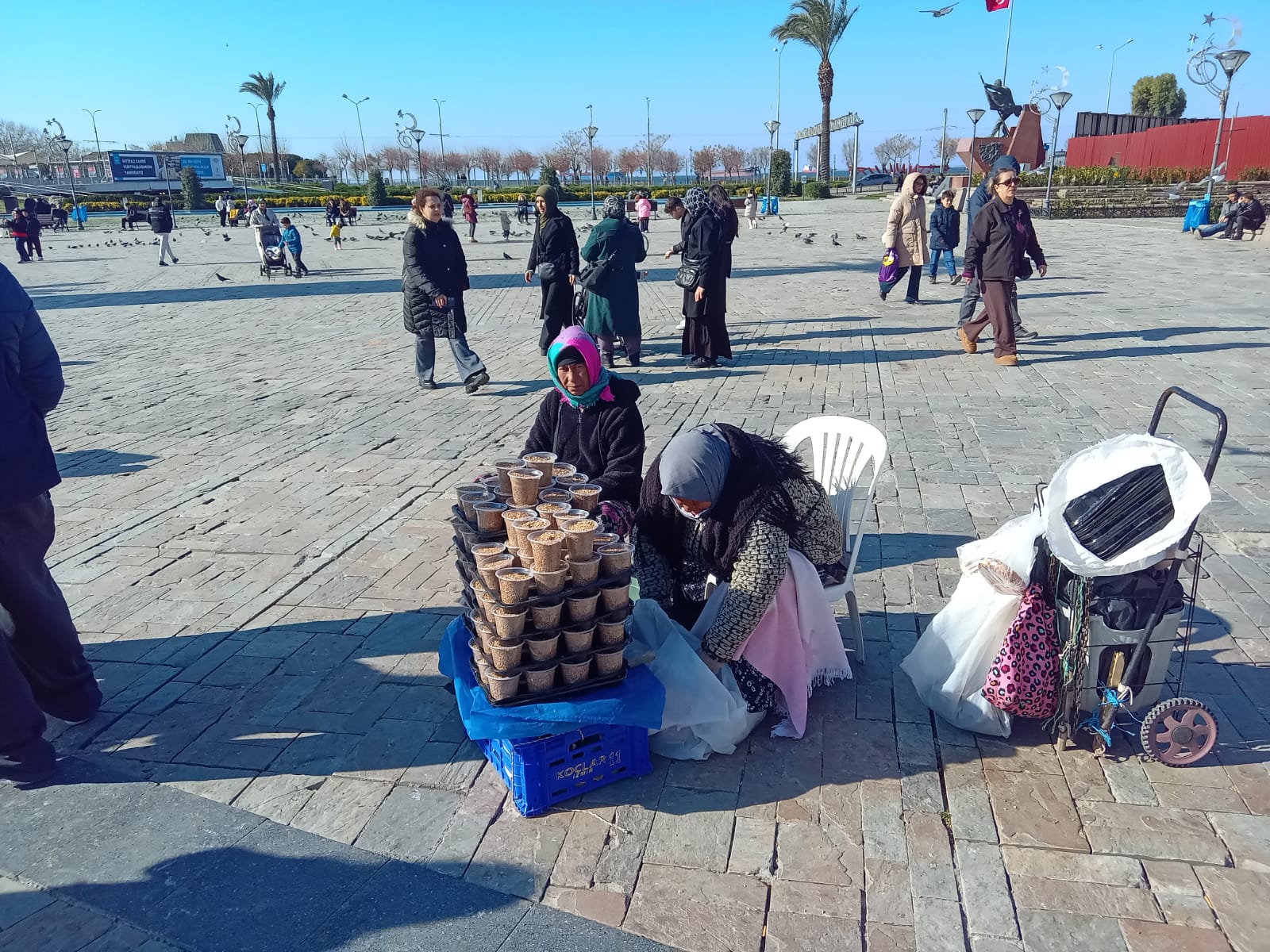 Plastik veya karton bardaklar sadece buğday ve mısırla dolu değil. O bardaklar; bayram ziyaretleri, okul çıkışları ve vapur sonrası yapılan kısa uğrakları hatırlatıyor. Çocuklar için Konak Meydanı, genellikle kuşların yanına bu denli yaklaşabilmenin anlamını taşıyor. Aynı satıcı, meydandaki değişimi şöyle özetliyor: “Saat Kulesi yerinde duruyor ama etrafı çok değişti. Eskiden insanlar daha uzun süre burada kalırdı. Şimdi hızlı geçiyorlar. Ama kuşlar hâlâ değişmedi. Yem atanları görünce hemen yanımıza geliyorlar.”
