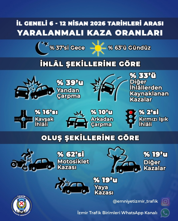 Raporda yer alan verilere göre İzmir genelinde meydana gelen yaralanmalı trafik kazalarının büyük bölümünde motosikletler yer aldı. Kazaların %62’sinde motosikletler, %19’unda yayalar ve %19’unda diğer kazalar öne çıktı. Raporda ayrıca kazaların %63’ünün gündüz saatlerinde %37’sinin ise gece saatlerinde meydana geldiği bildirildi.