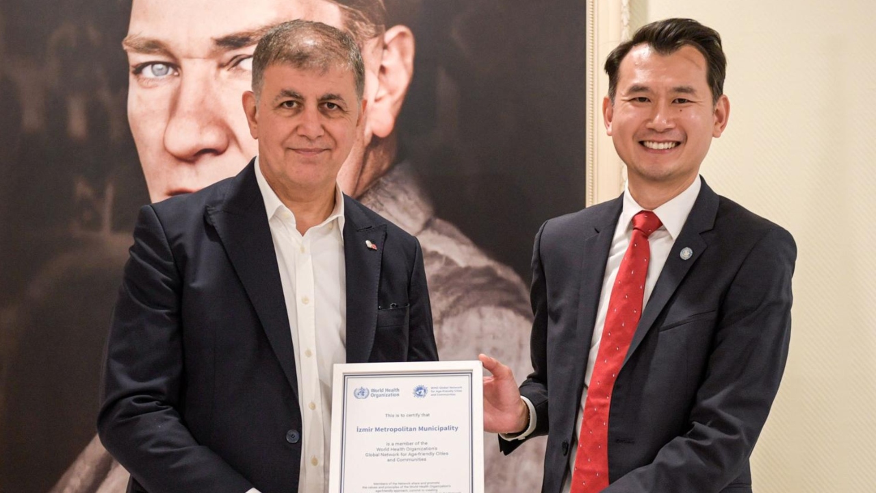 İzmir Büyükşehir Belediye Başkanı Cemil Tugay, Dünya Sağlık Örgütü’nün (DSÖ) Yaşlı Dostu Şehirler ve Topluluklar Küresel Ağı’na katılım sertifikasını aldı. Sertifika, DSÖ Avrupa Bölgesi Yaşlanma ve Sağlık Teknik Sorumlusu Dr. Yongjie Yon tarafından Başkan Tugay’a takdim edildi. Türkiye'de bu ağa dahil olan iki büyükşehirden biri olan İzmir, yaşlı bireyler için sunduğu hizmetler ile dikkat çekiyor. Toplantıya İzmir Büyükşehir Belediyesi yöneticileri ve DSÖ Türkiye temsilcileri de katıldı.
