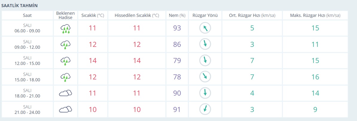 Bugün sabah saatlerinde etkili olan yağış, öğleden sonra azalacak. Akşam saat 17.00'den itibaren yağışların sona ermesi bekleniyor. Bugün için en düşük hava sıcaklığının 10 derece, en yüksek sıcaklığın ise 14 derece olacağı tahmin ediliyor.