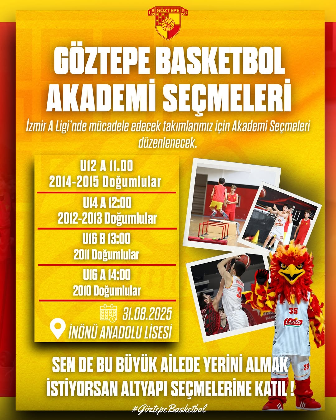 “Göztepe Basketbol Akademi Seçmeleri başlıyor! Basketbola tutkulu genç yetenekler sahne alıyor! Sen de bu büyük ailenin bir parçası olmak ister misin?