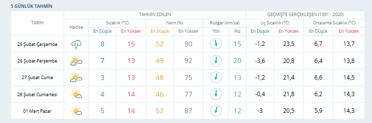 Meteoroloji verilerine göre 25 Şubat Çarşamba günü İzmir'de sağanak yağış beklenirken, sıcaklığın 15 derece civarında olması öngörülüyor. 26 Şubat Perşembe günü sıcaklık 13 dereceye düşecek ve yağışa ara verilecek. 27 Şubat Cuma günü hava parçalı bulutlu geçecek ve sıcaklık 13 derece civarında kalacak. İzmir'de hafta sonu 28 Şubat Cumartesi ve 1 Mart Pazar günleri ise hava parçalı bulutlu olacak, sıcaklıklar ise 14 derece civarında seyredecek.