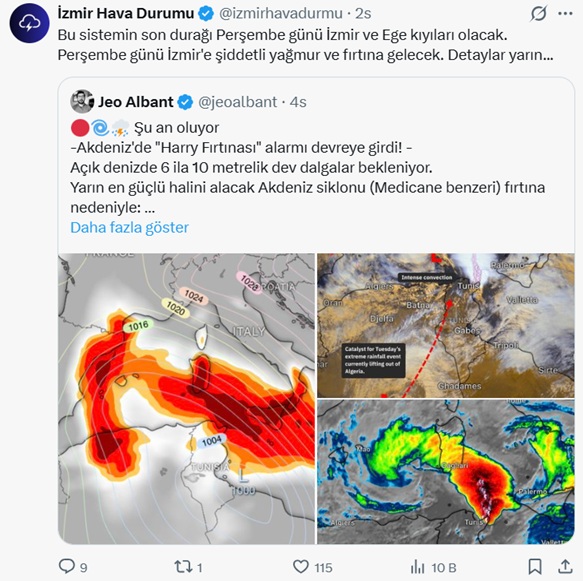 Paylaşımda “Açık denizde 6 ila 10 metrelik dev dalgalar bekleniyor. Yarın en güçlü halini alacak Akdeniz siklonu (Medicane benzeri) fırtına nedeniyle: