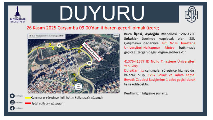 İZSU'nun Aydoğdu Mahallesi 1202-1250 sokaklarındaki çalışmaları sebebiyle 475 numaralı hattın güzergahı geçici olarak değiştirilecektir. ESHOT'un yaptığı açıklamaya göre 41376-41377 ID numaralı Tınaztepe Üniversitesi Yan Giriş durakları çalışma süresince hizmet veremeyecektir. İzmir Büyükşehir Belediyesi ESHOT Genel Müdürlüğü'nden yapılan açıklamada; “26 Kasım 2025 Çarşamba 09:00'dan itibaren Buca İlçesi, Aydoğdu Mahallesi 1202-1250 Sokaklar üzerindeki İZSU çalışmaları dolayısıyla 475 No’lu Tınaztepe Üniversitesi-Halkapınar Metro hattında geçici güzergah değişikliğine gidilecektir. 41376-41377 ID No’lu Tınaztepe Üniversitesi Yan Giriş Duraklarımız hizmet dışı kalacak, 1267 Sokak ve Yahya Kemal Beyatlı Caddesi kesişimine bir adet geçici durak tesis edilecektir.” ifadeleri yer aldı.