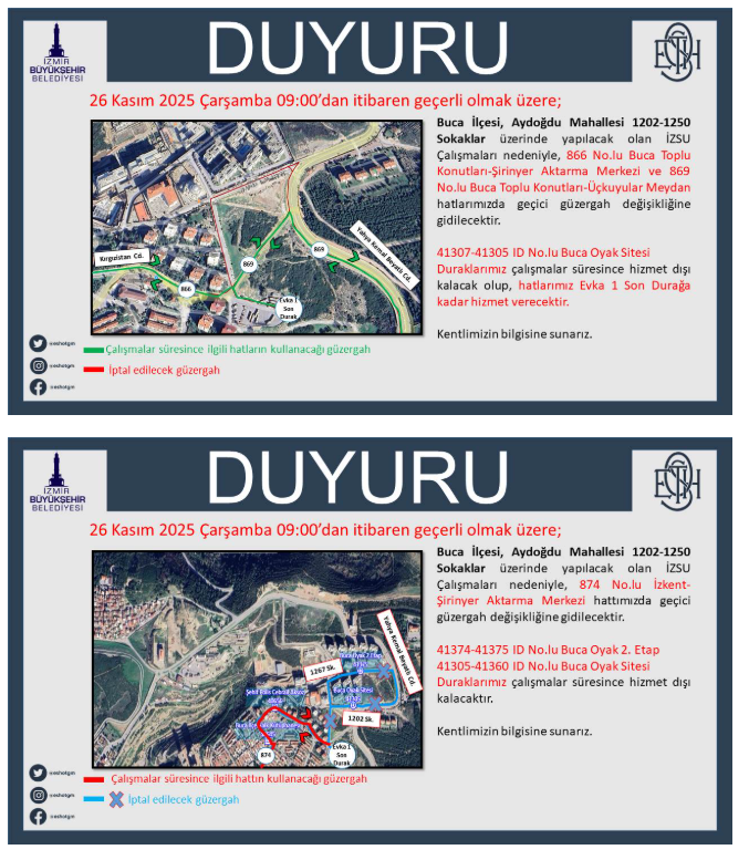 İZSU çalışmaları dolayısıyla 874 numaralı İzkent–Şirinyer Aktarma Merkezi hattında bazı duraklar da geçici olarak devre dışı bırakılacaktır. İzmir Büyükşehir Belediyesi ESHOT Genel Müdürlüğü, “26 Kasım 2025 Çarşamba 09:00'dan itibaren geçerli olacak şekilde, Buca İlçesi, Aydoğdu Mahallesi 1202-1250 Sokaklar üzerinde yapılacak olan İZSU çalışmaları nedeni ile 874 No'lu İzkent-Şirinyer Aktarma Merkezi hattında geçici güzergah değişikliği uygulaması yapılacaktır. 41374-41375 ID No'lu Buca Oyak 2. Etap ve 41305-41360 ID No'lu Buca Oyak Sitesi durakları çalışmalar süresince hizmette olmayacaktır.” açıklamasını yaptı.