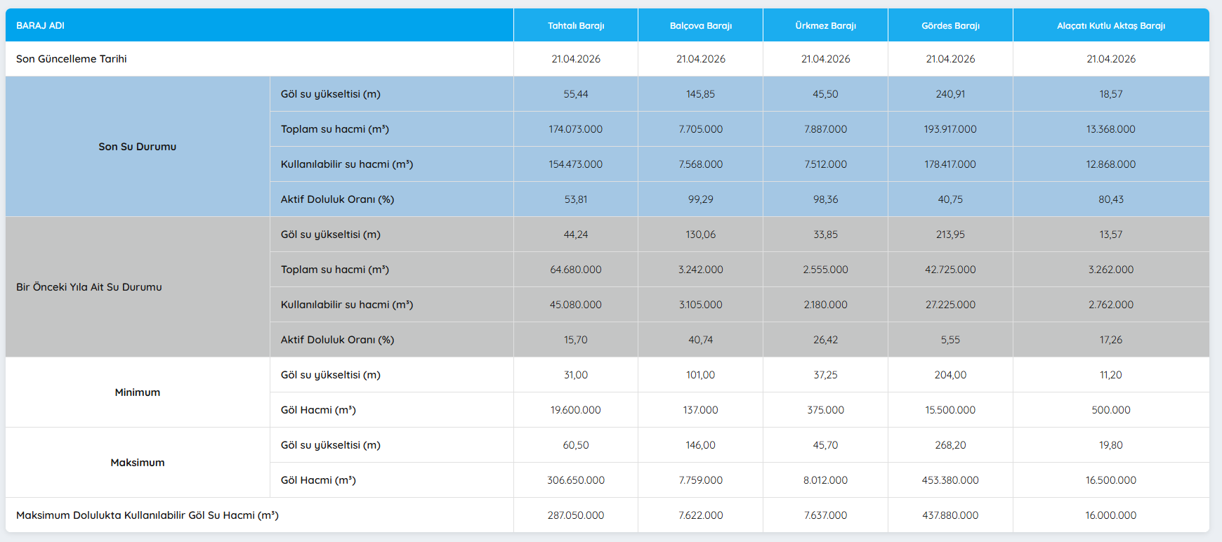 ALAÇATI KUTLU AKTAŞ BARAJI'NIN 21 NİSAN 2026 TARİHLİ VERİLERİ