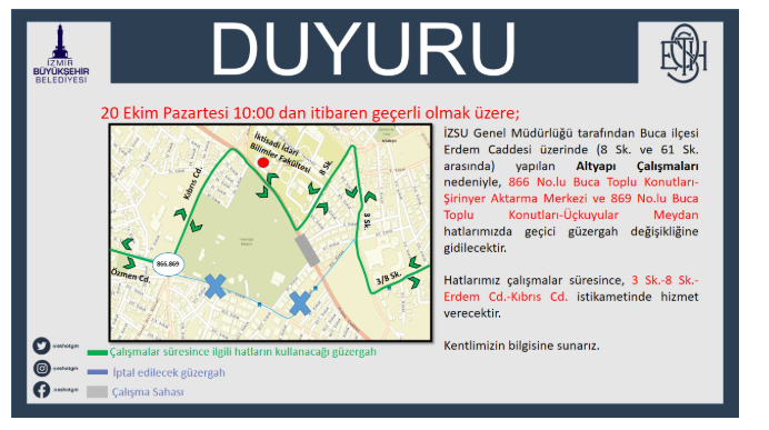 ESHOT'un gerçekleştirdiği duyuruda şu ifadelere yer verildi: “20 Ekim Pazartesi 10:00'dan itibaren geçerli olmak üzere; İZSU Genel Müdürlüğü tarafından Buca ilçesi Erdem Caddesi üzerinde (8. Sokak ile 61. Sokak arasında) yapılan altyapı çalışmaları nedeniyle, 866 No.lu Buca Toplu Konutları- Şirinyer Aktarma Merkezi ve 869 No.lu Buca Toplu Konutları-Üçkuyular Meydan hatlarında geçici güzergah değişikliğine gidilecektir. Hatlarımız çalışmalar süresince, 3. Sokak-8. Sokak-Erdem Caddesi-Kıbrıs Caddesi istikametinde hizmet verecektir. Kamuoyuna saygıyla duyurulur.”