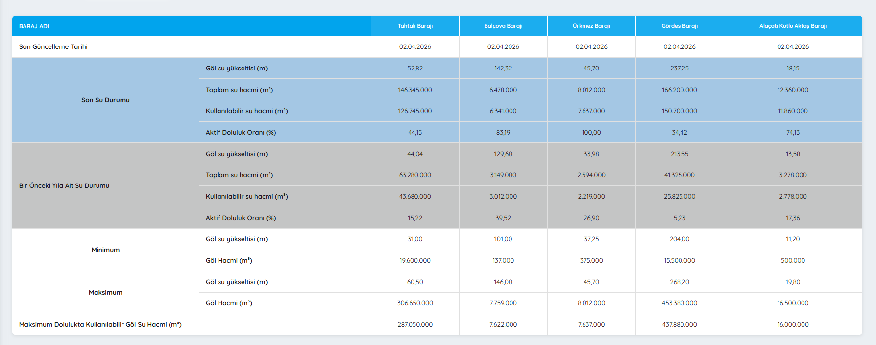 İzmir Su ve Kanalizasyon İdaresi (İZSU), 2 Nisan 2026 tarihi itibarıyla İzmir'deki barajların güncel doluluk oranlarını açıkladı. Uzun süredir kritik seviyelerde seyreden İzmir barajlarında geçtiğimiz haftalardaki etkili olan yağışlar sonrası artış gözlenmişti. İzmir'de yeniden yağışlar başlamışken ve Meteoroloji verilerine göre hafta boyu sürmesi beklenirken İZSU'dan rahatlatan veriler geldi. İşte İzmir barajlarında güncel durum…
