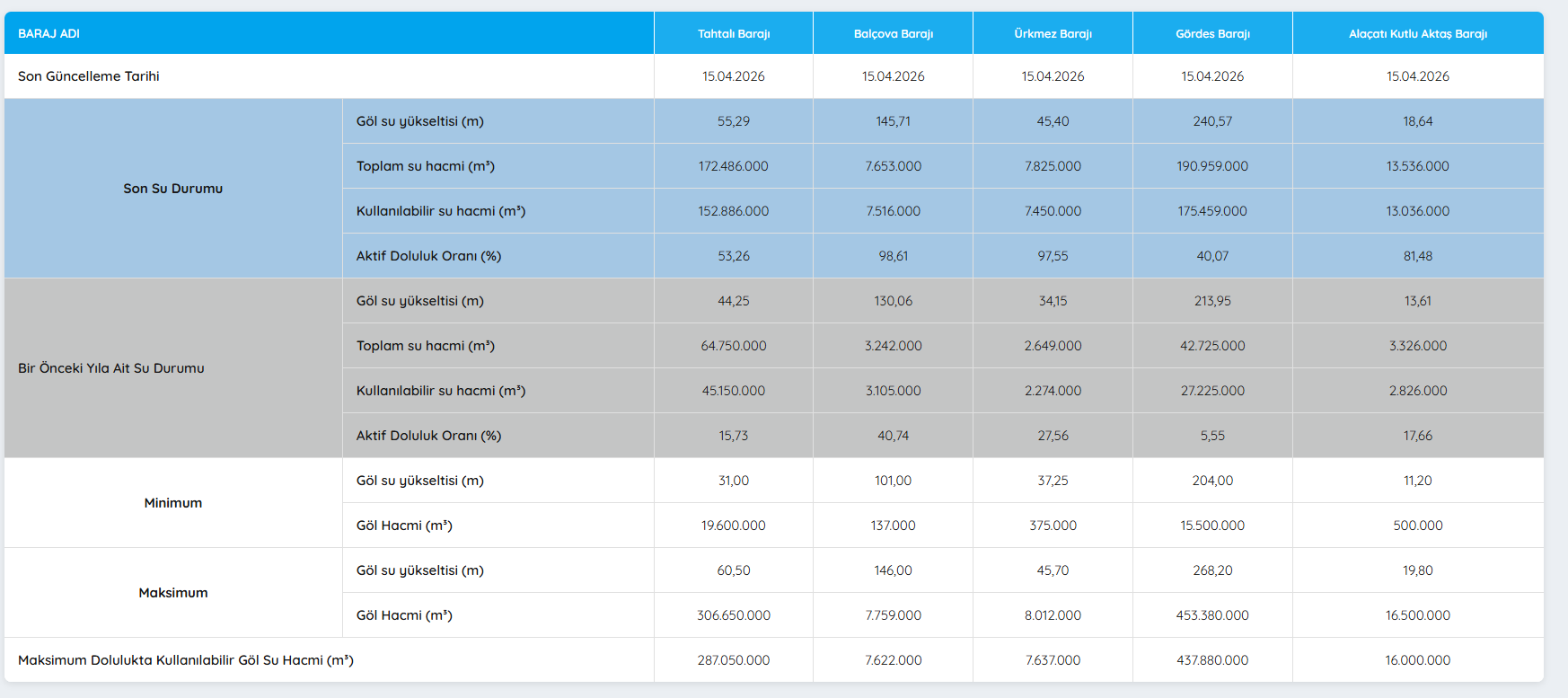 İzmir Su ve Kanalizasyon İdaresi’nin (İZSU) 15 Nisan 2026 tarihli verileri İzmir genelinde birçok barajda geçen yılın aynı dönemine göre belirgin artış yaşandığını ortaya koyuyor. İşte İzmir'deki barajlarda güncel durum…