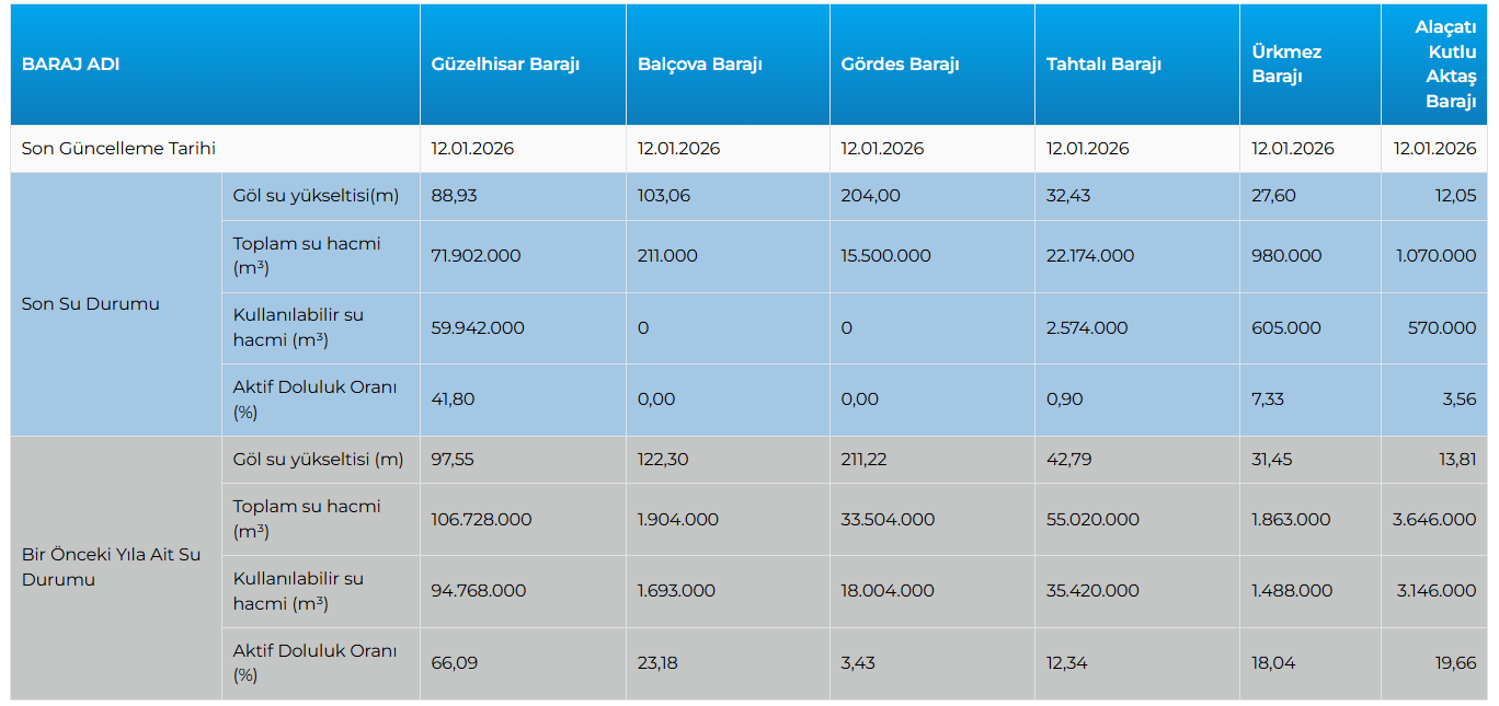 İzmir Su ve Kanalizasyon Genel Müdürlüğü'nün 12 Ocak 2026 tarihli verilerine göre, Balçova Barajı %0,00, Gördes Barajı %0,00, Tahtalı Barajı %0,90, Ürkmez Barajı %7,33, Güzelhisar Barajı %41,80, Alaçatı Kutlu Aktaş Barajı ise %3,56 doluluk oranına sahiptir.