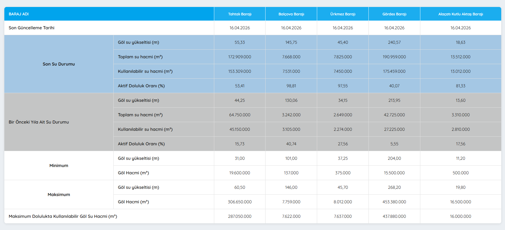 İzmir Su ve Kanalizasyon İdaresi (İZSU) tarafından aktarılan 16 Nisan 2026 tarihli veriler, İzmir genelinde birçok barajda geçen yılın aynı dönemine göre belirgin artış yaşandığını ortaya koydu. İşte İzmir'deki barajlarda güncel durum…