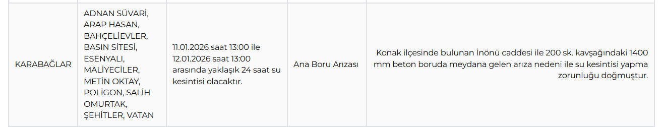 Karabağlar ilçesinde ise Adnan Süvari, Arap Hasan, Bahçelievler, Basın Sitesi, Esenyalı, Maliyeciler, Metin Oktay, Poligon, Salih Omurtak, Şehitler ve Vatan mahalleleri 11.01.2026 13:00 ile 12.01.2026 13:00 saatleri arasında yaklaşık 24 saat su kesintisinden etkilenecek.