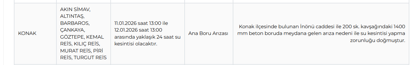 Bu kesinti sırasında Konak ilçesindeki Akın Simav, Altıntaş, Çankaya, Göztepe, Kemal Reis, Kılıç Reis, Murat Reis, Piri Reis ve Turgut Reis mahalleleri, 11.01.2026 saat 13:00 ile 12.01.2026 saat 13:00 arasında yaklaşık 24 saat su alamayacak.