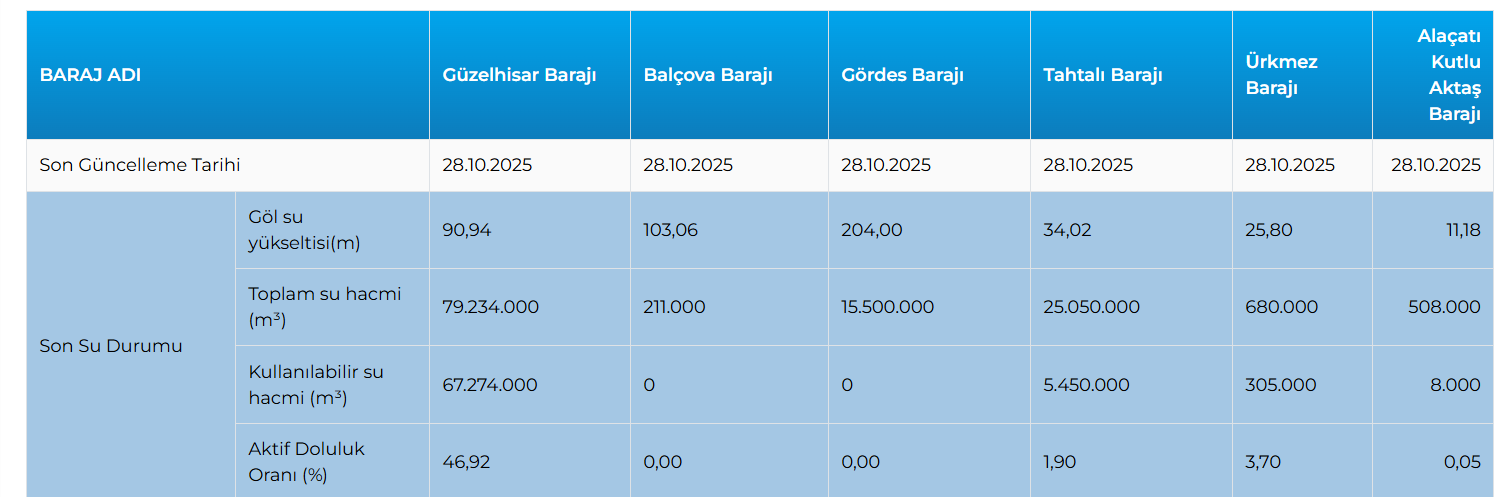 İzmir, uzun süredir beklenen yağışlara kavuşmuş olsa da su kaynakları açısından endişe verici bir tablo sergilemekte. İZSU Genel Müdürlüğü’nün 28 Ekim 2025 tarihli verilerine göre, İzmir'in içme suyu temininde kritik öneme sahip 6 barajdan 3’ü tamamen kurudu. Alaçatı Kutlu Aktaş, Gördes ve Balçova barajları tamamen doluluk oranı sıfıra inerek devre dışı kalmış durumda.