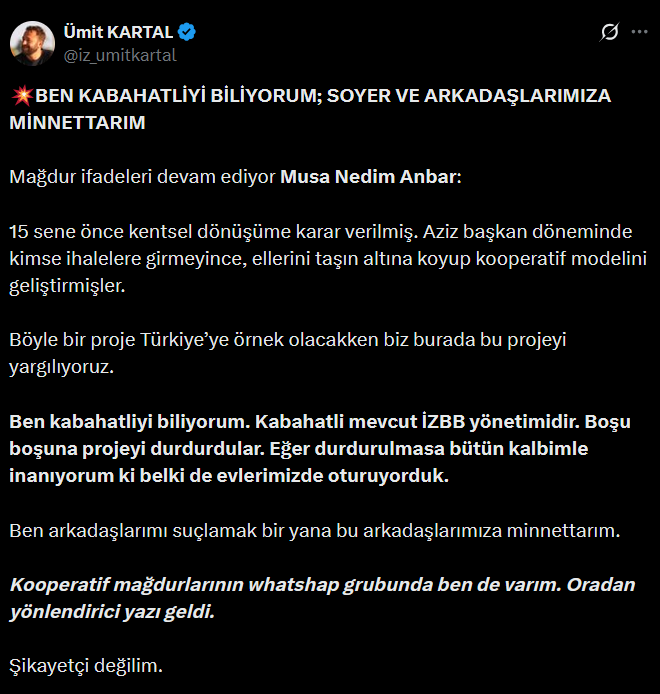 Mağdur ifadeleri süregeldikçe Musa Nedim Anbar, “15 yıl önce kentsel dönüşüm kararı alındı. Aziz başkan döneminde kimse ihalelere girmediği için, kooperatif modelini geliştirme konusunda ellerini taşın altına koydular. Böyle bir proje, Türkiye’ye örnek olabilecekken, şimdi burada yargılanıyoruz. Ben suçluyu biliyorum. Suçlu mevcut İZBB yönetimidir. Bu projeyi durdurarak hiçbir şey kazanmadılar. Eğer projeyi durdurmasalardı, inandığım kadarıyla belki de evlerimizde yaşıyor olacaktık. Arkadaşlarımı suçlamak yerine, onlara minnettarım. Kooperatif mağdurlarının WhatsApp grubunun bir parçasıyım ve oradan yönlendirici mesajlar aldım. Ben şikayetçi değilim.” dedi.