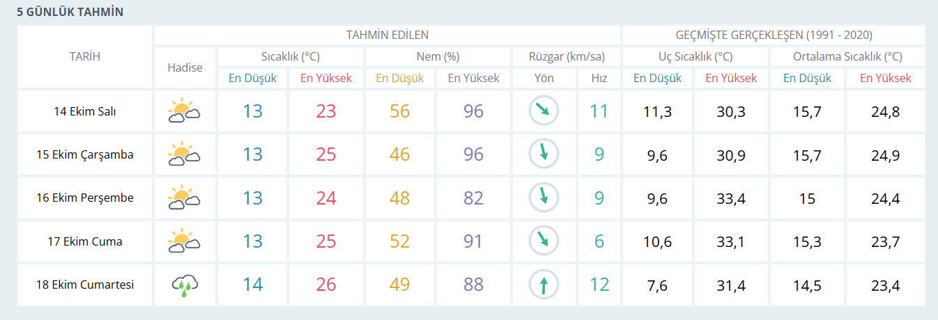 Haftalık hava durumu boyunca kentte genel olarak parçalı ve az bulutlu bir hava hakim olacak. 14 Ekim Salı günü 23 derece olarak beklenen sıcaklık, 15 Ekim Çarşamba günü 25 dereceye kadar çıkacak. 16 Ekim Perşembe günü 24 derece, 17 Ekim Cuma günü 25 derece, 18 Ekim Cumartesi günü ise 26 derece ölçülmesi bekleniyor.