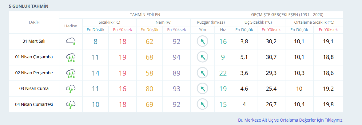 • Bayındır: 19°C, parçalı ve çok bulutlu, yerel olarak aralıklı sağanak ve yer yer kısa süreli gök gürültülü sağanak yağmurlu.