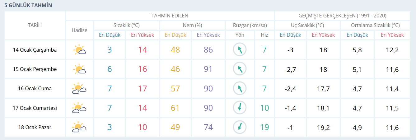 Meteoroloji verilerine göre İzmir’de 14 Ocak Çarşamba günü hava sıcaklığı 14 derece olacak. 15 Ocak Perşembe günü sıcaklıkların 16 dereceye, 16 Ocak Cuma günü ise 17 dereceye kadar yükselmesi bekleniyor. Hafta sonunda ise sıcaklıklarda düşüş öngörülüyor. 17 Ocak Cumartesi ve 18 Ocak Pazar günleri hava sıcaklığının 10 ile 14 derece arasında seyredeceği bildirildi.