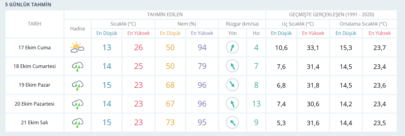 Hava durumu raporlarına göre, 17 Ekim Cuma günü İzmir'de hava parçalı ve az bulutlu olacak; sıcaklık 26 derece civarında ölçülecek. 18 Ekim Cumartesi günü yağışların başlaması beklenirken, sıcaklıkların 25 dereceye düşeceği tahmin ediliyor. 19 Ekim Pazar günü de yağışların devam edeceği ve sıcaklıkların 23 dereceye gerileyeceği ön görülüyor. Yeni haftanın ilk günleri olan 20 Ekim Pazartesi ve 21 Ekim Salı günlerinde de sağanak yağışların etkili olması bekleniyor; hava sıcaklıkları 23 derece civarında kalacak.