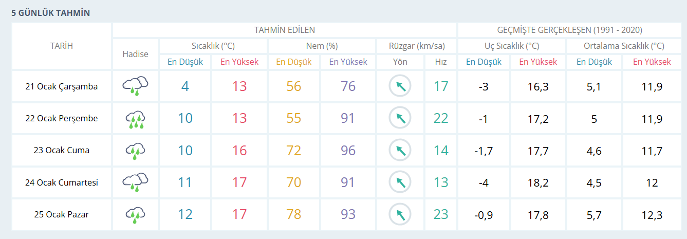 Meteoroloji’nin raporlarına göre, İzmir’de hava sıcaklıklarının önümüzdeki günlerde yavaş yavaş artması bekleniyor. 21 Ocak Çarşamba günü genel olarak aralıklı yağışların olacağı öngörülürken, sıcaklıkların 13 derece civarında seyredeceği tahmin ediliyor. 22 Ocak 2026 Perşembe günü de yağışlı havanın devam etmesi bekleniyor ve bu tarihlerde sıcaklıkların yine 13 derece seviyelerinde olacağı belirtiliyor. 23 Ocak Cuma günü itibarıyla yağışların süreceği öngörülürken, sıcaklıkların 16 dereceye yükselebileceği belirtiliyor. Hafta sonu ise hava sıcaklıklarının daha da artması bekleniyor; 24 Ocak Cumartesi ve 25 Ocak Pazar günlerinde sıcaklıkların 17 derece civarında olacağı, ancak yağışların etkisini sürdüreceği ifade ediliyor.