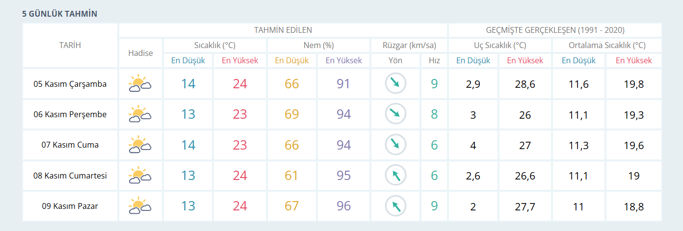 6 Kasım Perşembe günü, hava sıcaklığı 23 dereceye gerileyecek ve bulutlu hava etkisini sürdürecek. 7 Kasım Cuma günü de benzer sıcaklıklarla birlikte gökyüzünün kapalı kalması bekleniyor.