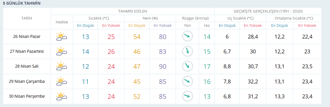 26 Nisan Pazar günü İzmir genelinde hava sıcaklıklarının 25 derece civarında seyretmesi bekleniyor. İzmir genelinde parçalı ve az bulutlu bir gökyüzü hakim olacak. Gün içerisinde hava koşullarında yer yer değişiklikler yaşanabilir.