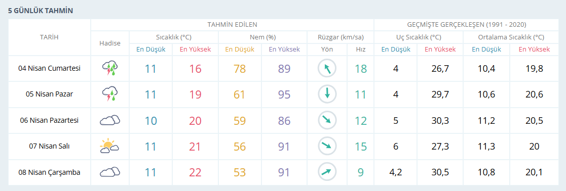 5 Nisan Pazar günü ise sıcaklığın 19 dereceye kadar yükselmesi öngörülüyor. Ancak artan sıcaklığa rağmen yağışlı sistemin İzmir genelinde etkisini sürdüreceği ve gök gürültülü sağanakların devam edeceği ifade edildi.