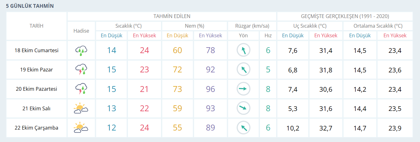 Meteorolojik verilere göre, yağışlar 18 Ekim Cumartesi günü İzmir genelinde başlayacak ve özellikle pazar günü etkisini artırarak sağanak şeklinde devam edecek. Pazartesi günü hava sıcaklıklarının 21 dereceye düşmesi bekleniyor, salı günü ise hava 22 derece dolaylarında seyredecek. Çarşamba günü ise sıcaklık 24 dereceye çıkacak ve yağış beklenmiyor.