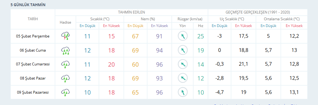 Meteoroloji verilerine göre 5 Şubat Perşembe günü İzmir'de hava sıcaklıklarının 15 dereceye düşmesiyle birlikte güçlü sağanak yağış beklenmektedir. 6 Şubat Cuma günü sıcaklıkların 18 derece civarında olması ve sağanak yağışların tekrar etkili olması öngörülüyor. 7 Şubat Cumartesi günü sağanak yağışların devam etmesi, sıcaklıkların ise 20 dereceye kadar çıkması bekleniyor. 8 Şubat Pazar günü yağışlı havanın süreceği ve sıcaklıkların 18 derece civarında olacağı tahmin ediliyor.