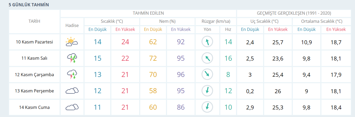 12 Kasım Çarşamba günü 21 derece sıcaklıkta sağanak yağışların devam etmesi bekleniyor. 13 Kasım Perşembe ve 14 Kasım Cuma günlerinde ise yağışların yerini bulutlu bir havaya bırakması öngörülüyor. Sıcaklıklar hafta boyunca 21-24 derece aralığında seyredecek.