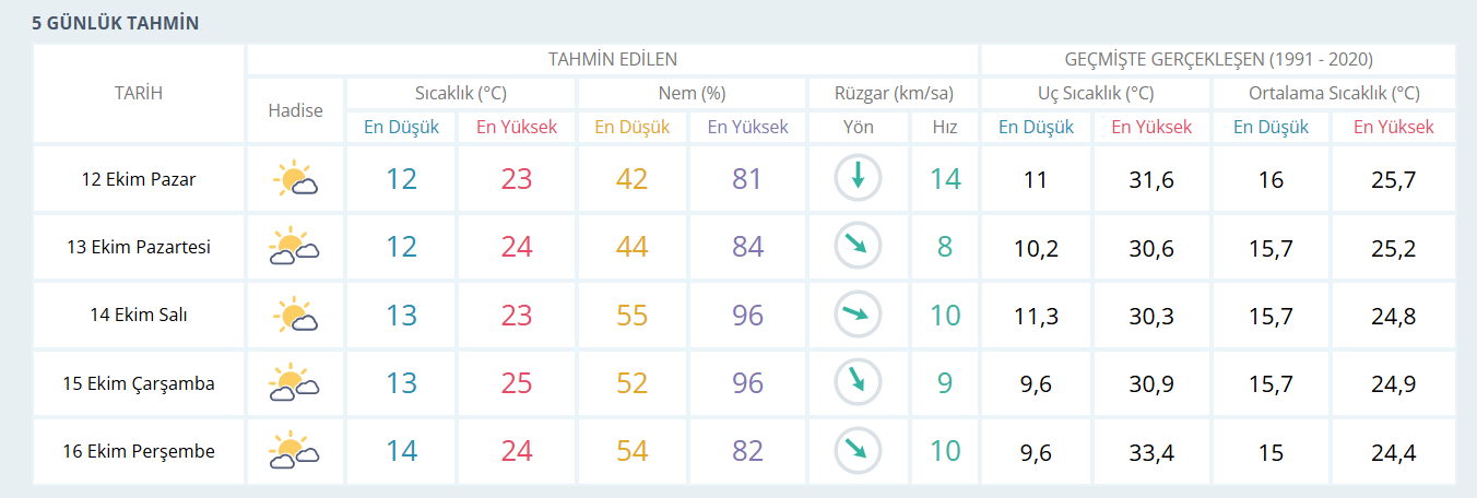 Hafta sonunun ardından, yeni haftanın ilk günlerinde sıcaklıklar bir miktar artış gösterecek. 13 Ekim Pazartesi günü hava 24 derece ile başlayacak, ardından Salı günü 23 dereceye gerileyip, Çarşamba günü yeniden 25 dereceye yükselecek.